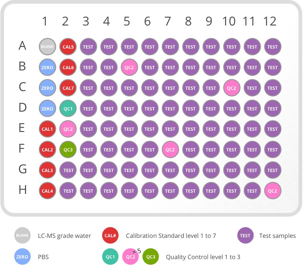 The kit consists of a patented 96-well filter plates with internal standards already integrated, system suitability test samples, lyophilized calibration standards and quality controls (QCs), which are reconstituted according to protocol. Experimental samples are registered in WebIDQ and arranged together with the calibration and QC samples on a 96-well plate layout.