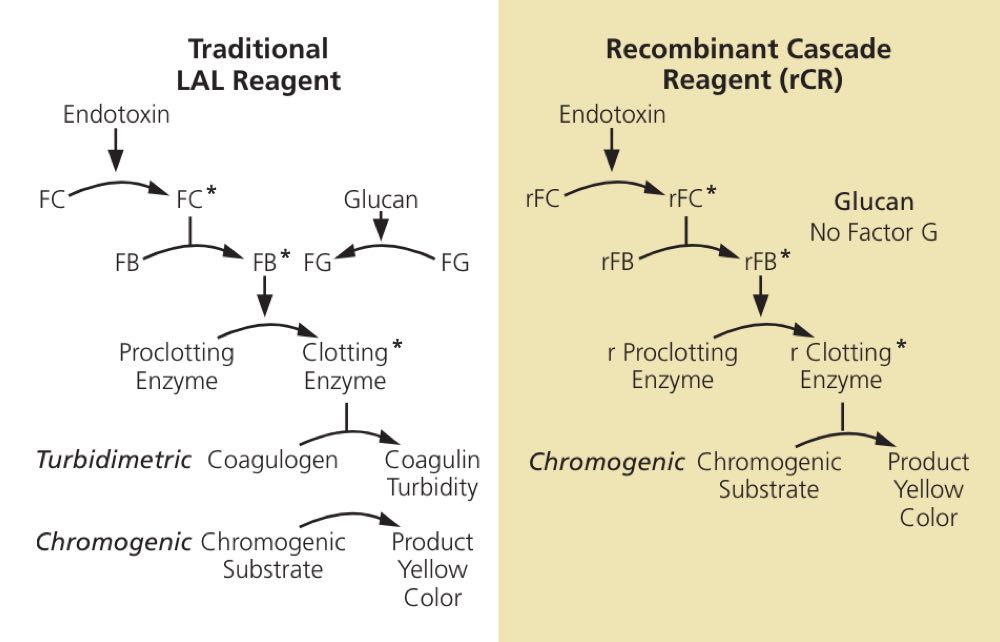 Figure 1: Traditional and Recombinant LAL Cascades. In the traditional cascade on the left, an extract from horseshoe crabs is used. This contains protein zymogens sensitive to both endotoxins and glucans. On the right-hand side, the same cascade for endotoxin detection is derived from recombinant proteins. This reagent does not have the proteins present in the biological extract (FG) that can lead to cross-reactivity with (1→3)-β-D-glucans. Abbreviations: FC-Factor C, FB-Factor B, FG-Factor G, asterisks denote activated enzyme forms. See reference 4 for more details.