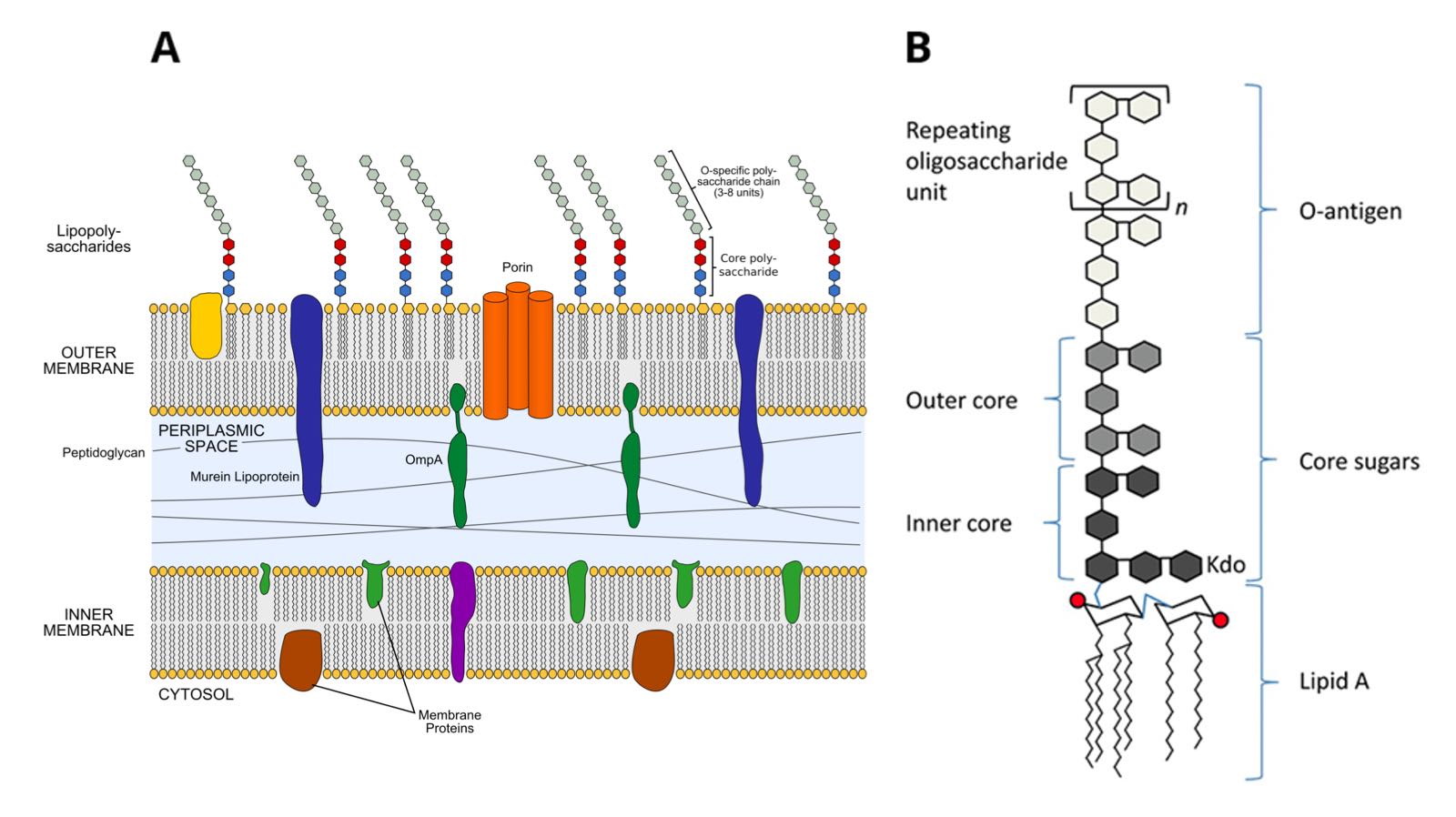 Figure 2: Endotoxin is a major constituent of the outer membrane of gram-negative bacteria A.) Gram-negative cell envelope © Jeff Dahl, CC BY-SA 4.0 via Wikimedia Commons (6) B.) Endotoxin structural schematic, CC BY 3.0 (7)
