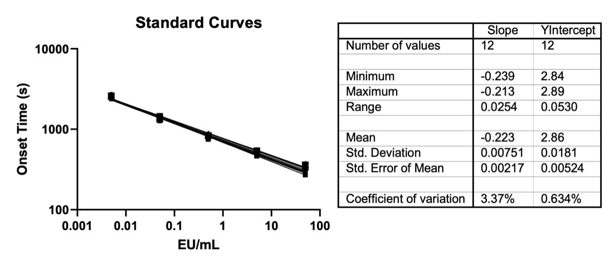 Figure 3: Example Standard Curves for PyroSmart NextGen® executed by Andrew+. Twelve plates of data were collected on at least 4 different days using identical lots of reagents and reference standard endotoxin. A standard curve for each plate was constructed and dispensed from a new set of dilutions for each plate. Linear fits were performed on log-log plots from each plate. The standards used for these curves are 50, 5, 0.5, 0.05, and 0.005 EU/mL. The associated plot has all onset time replicates included (there are a total of 36 points per x-axis value).