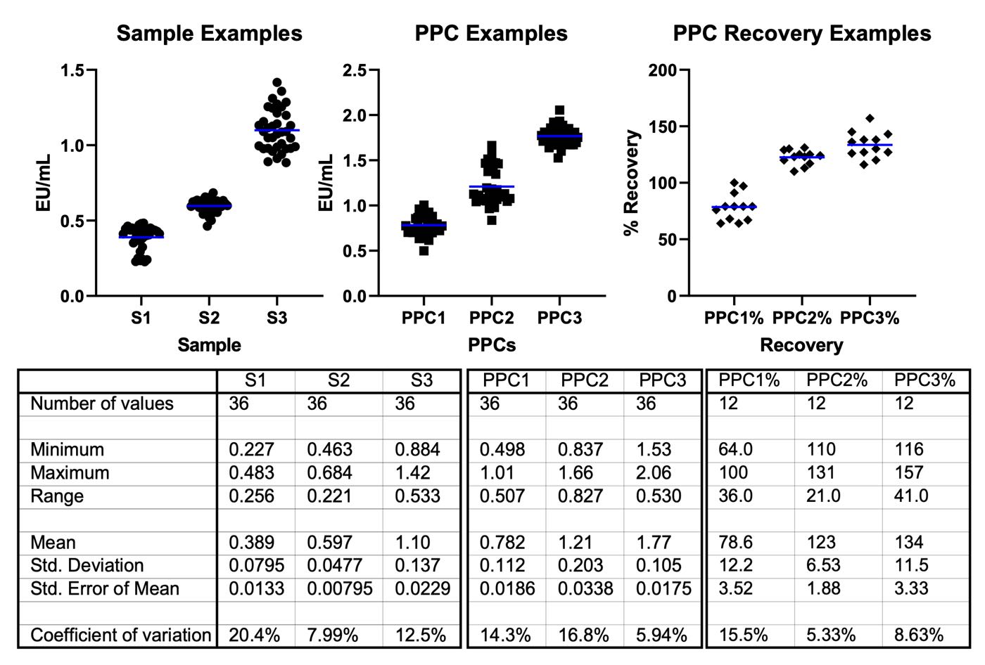 Figure 4: Example Sample PPC and Recovery results for PyroSmart NextGen® executed by Andrew+. The line in the scatter plot indicates the mean value for each set. The results are derived from the same plates as in Figure 3 and EU/mL results calculated from their associated standard curves. Thirty-six data points were collected over 12 plates for each Sample and PPC. PPCs were made by spiking 270 μL of each sample with 30 μL of 5.0 EU/ml standard, targeting a 0.5 EU/mL final concentration. PPC recovery calculated by dividing the spike target concentration (0.5 EU/ml) by the measured concentration of each point, shown as a percentage.