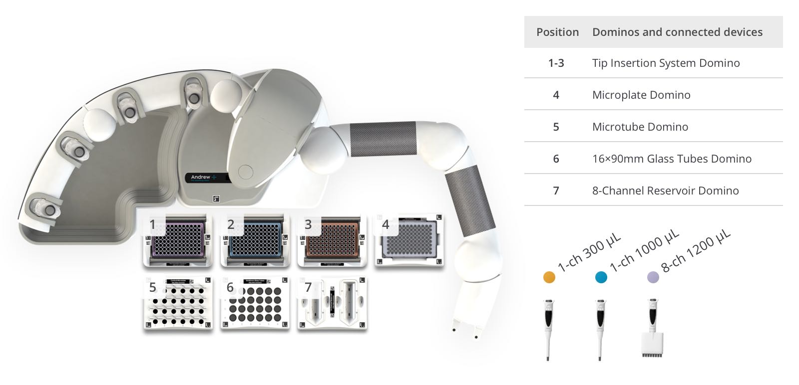 Andrew+ System Components: Dominos, Devices, Electronic Pipettes & Tips